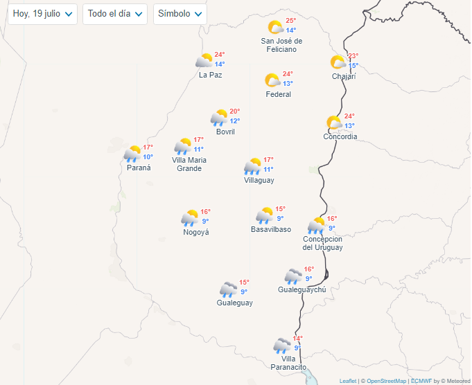Mientras que en Concordia, Federal, Feliciano, Federación y San Salvador, en tanto, se espera una mínima de 12 grados y una máxima de 19 grados. Allí también se prevé una jornada con chaparrones.