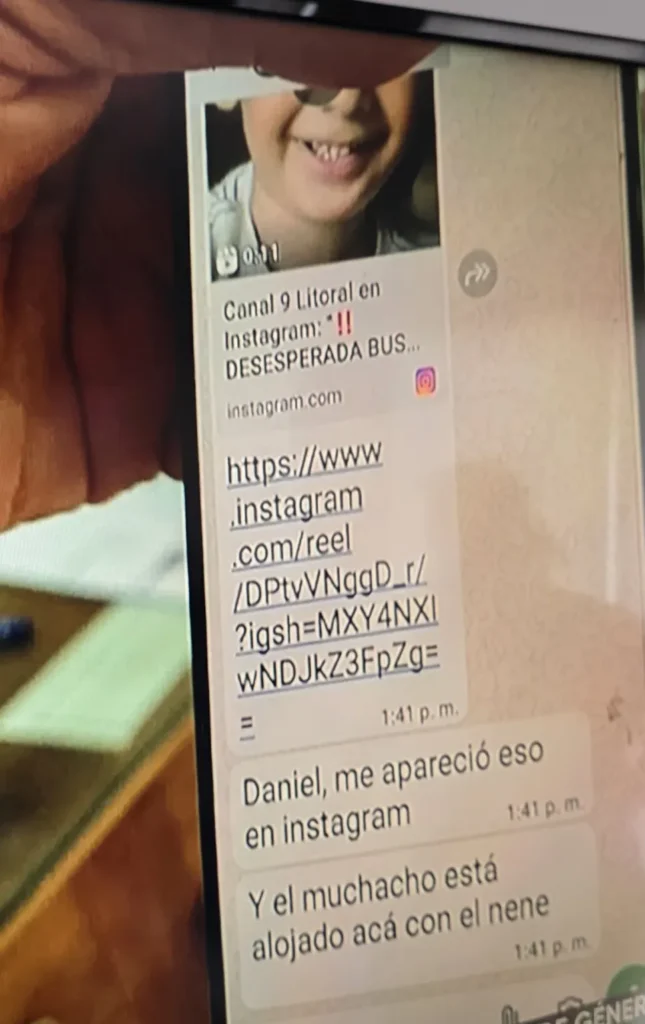 El hotelero también hizo referencia al aviso que recibió por parte de una de sus empleadas, que había visto la publicación del Instagram de Canal 9 Litoral, en que se daba cuenta del Alerta Sofía y la búsqueda del sospechoso. Ella le envió un mensaje y dieron aviso a la Policía, que ya estaba al tanto de su ubicación y preparaba un operativo.