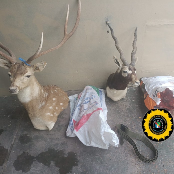 En Estación Sosa, en la vivienda ubicada en Los Talas y Los Cardenales, habitada por Jesús Vargas, se secuestraron un fusil Remington calibre .270, una pistola Bersa calibre .308, cartuchería correspondiente y 40 kilos de carne de ciervo Axis. La médica veterinaria policial constató la especie, y se efectuó el acta de infracción.