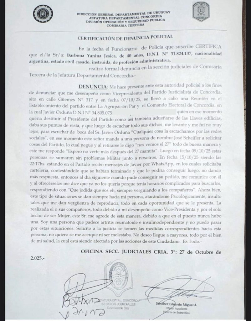 La denuncia fue presentada el 27 de octubre de 2025 ante la Policía de Entre Ríos, y describe una serie de agresiones verbales y amenazas que, según la víctima, ocurrieron en distintos encuentros partidarios. El hecho más grave se habría registrado el 7 de octubre, durante una reunión entre el Comando Electoral y la agrupación PAR, espacio interno que lidera Orduna.