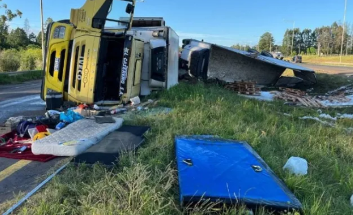 Según se informó a IMPACTO DE NOTICIAS, un camión Iveco 440, que transportaba cajones de pollo congelado, protagonizó un impactante vuelco sl desprenderse su acoplado y terminara cayendo al cantero central. El impacto provocó la destrucción del acoplado y el desparramo de la carga sobre el suelo.