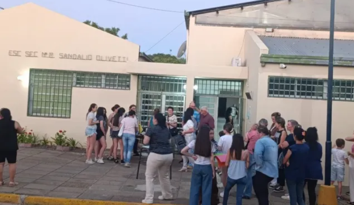 Frente al edificio de la Escuela “Sandalio Olivetti”, docentes, ex docentes, familiares de alumnos, alumnos y ex alumnos de la institución y de otras, incluso de localidades vecinas, expresaron el rechazo a la situación de violencia que tuvo lugar en las últimas horas, hacia la rectora, Gisela Brutomeso.