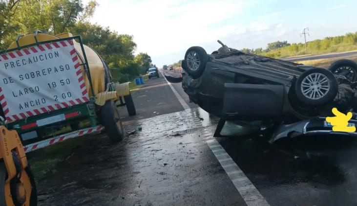 Por causas que son materia de investigación, un automóvil Peugeot 208 que circulaba en sentido Sur–Norte protagonizó un vuelco. A raíz de la maniobra, el rodado quedó tendido sobre el carril contrario de circulación, aunque afortunadamente no impactó contra otros vehículos.