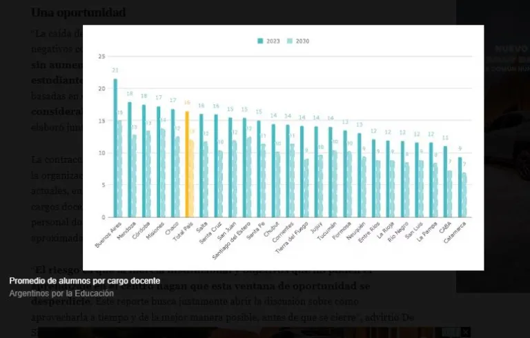 Los datos surgen del informe “Presente y futuro de la cantidad de alumnos por docente y por grado”, elaborado por Argentinos por la Educación, con autoría de Martín De Simone, María Sol Alzú y Martín Nistal, a partir de proyecciones demográficas de la Dirección Nacional de Población y del Relevamiento Anual de la Secretaría de Educación.