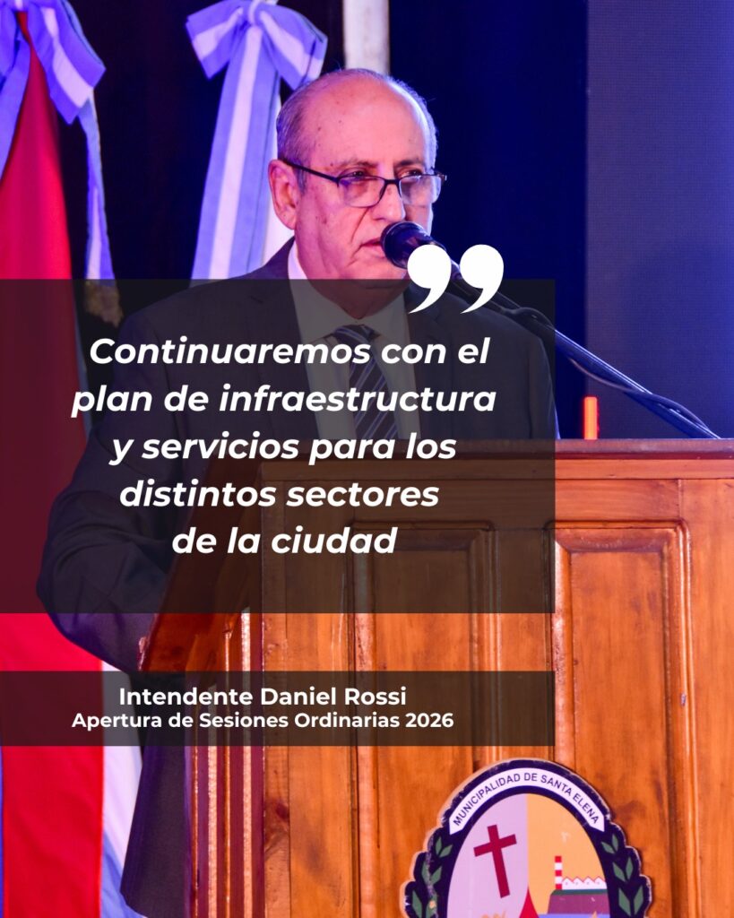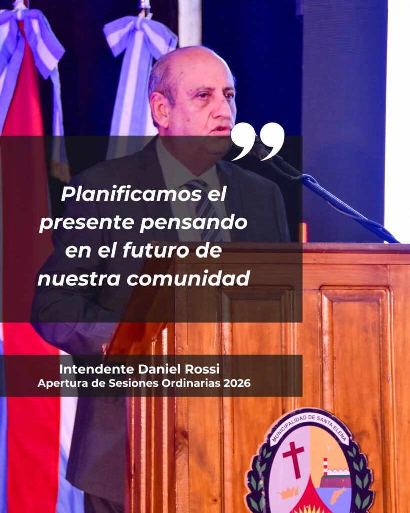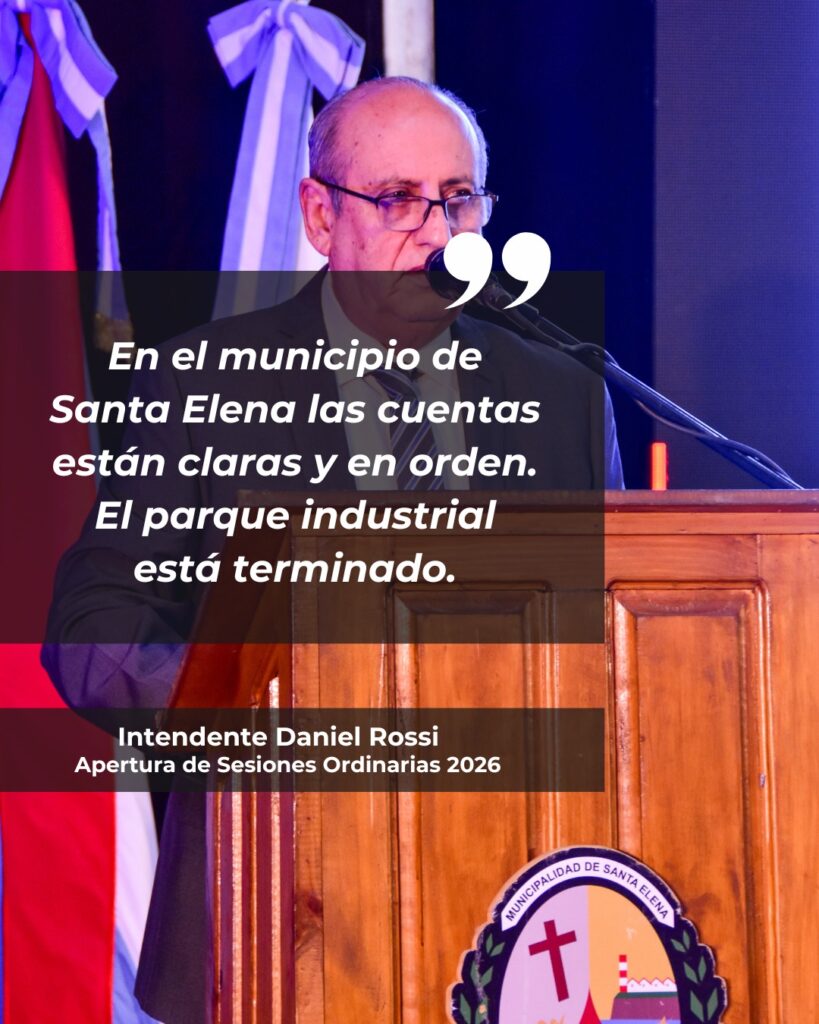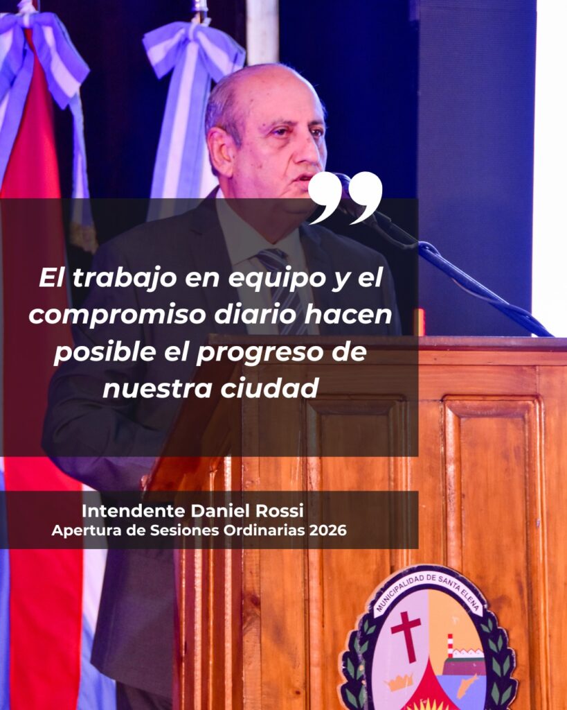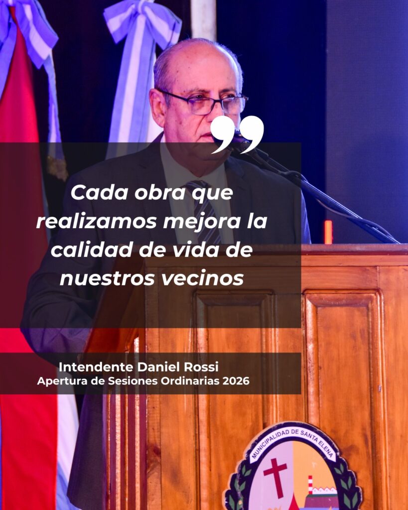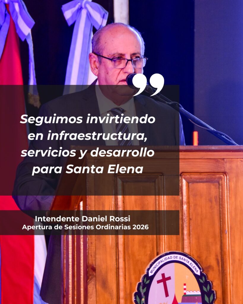 El presidente municipal de Santa Elena, Domingo Daniel Rossi, dejó inaugurado el período de Sesiones Ordinarias 2026 del Honorable Concejo Deliberante, dando cumplimiento a lo establecido por la normativa vigente y presentando ante concejales, autoridades institucionales y vecinos un balance de la gestión correspondiente al año 2025, junto con los principales lineamientos y proyectos previstos para el presente año.