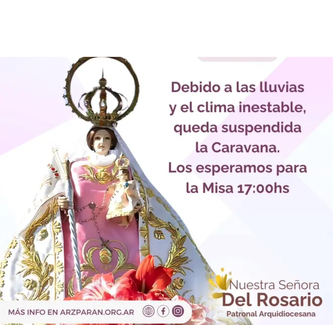 El Arzobispado de Paraná informó oficialmente que se suspende la procesión prevista para este lunes 7 de octubre en la ciudad con motivo de la celebración de Nuestra Señora del Rosario.